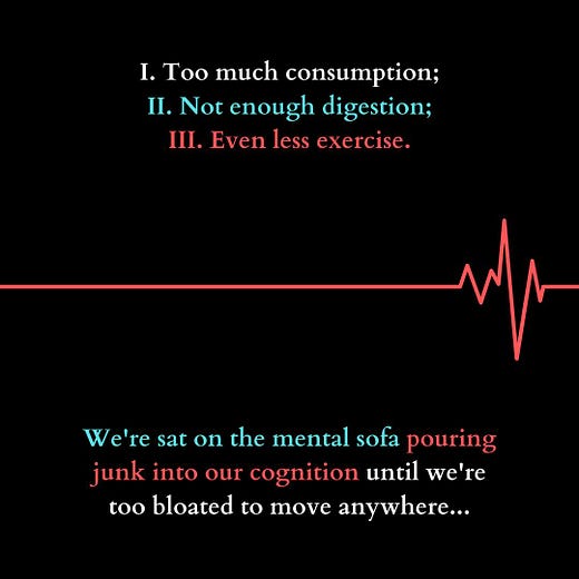 Everyone knows about the over-consumption of food, but did you ever think that you might consume too much information? We're constantly connected to the internet and we get fed new information almost every second. Instead, we should focus on digesting that information (which is what I'm trying to do with this newsletter by summarizing what I learn) and then do exercise to clear your mind (meditation, yoga).